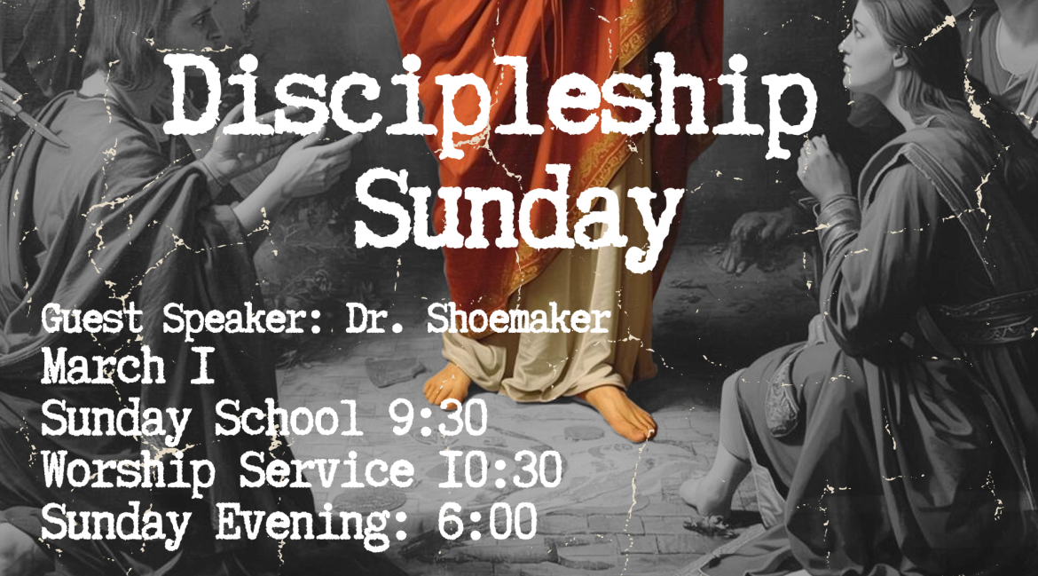 On Sunday, March 1, we will focus on understanding discipleship. Guest speaker Dr. Shoemaker will deliver timely Biblical truths during our combined Sunday school time at 9:30, Worship service at 10:30, and evening service at 6:00.